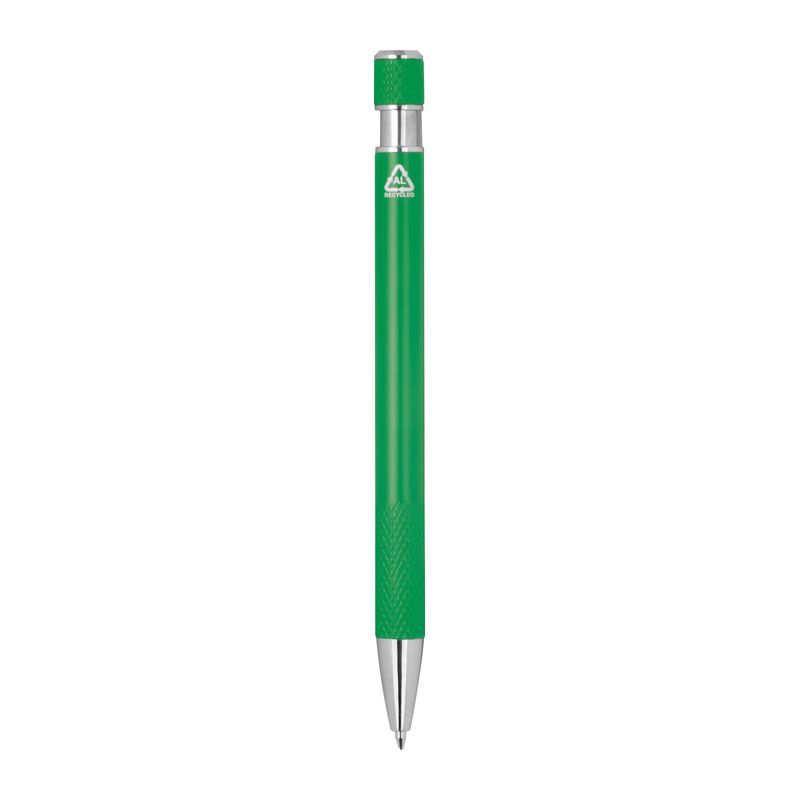 Guľôčkové pero vyrobené z recyklovaného hliníka so vzorovaným úchopom, tlačidlovým mechanizmom a modrou náplňou.