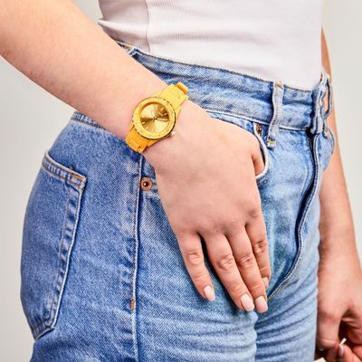 The Albane watches are playful & vibrant accessories, with their golden accents & soft textures giving them a luxurious and feminine final feel. Available in 6 vibrant tones : Navy, Yellow, Brown or Nude, Black & Light blue, they are easy to mix & match with other accessories of our collection.