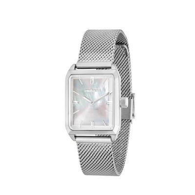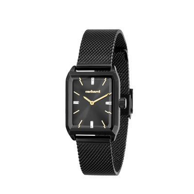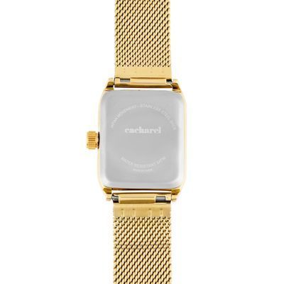The Philomène watch in gold features a refined Milanese mesh bracelet paired with a crisp gold case, creating a sleek and timeless silhouette. Its mother-of-pearl dial is detailed entirely in gold, with a single stone adding a subtle hint of light. With its perfectly proportioned angular case, it offers an elegant and enduring sense of style.