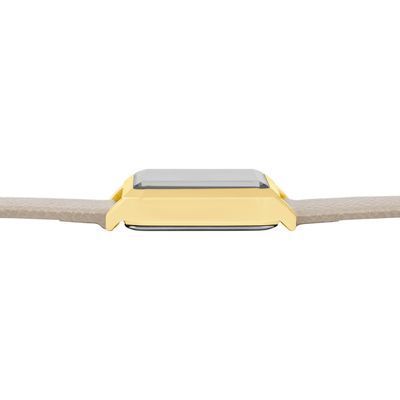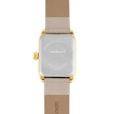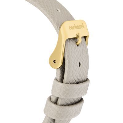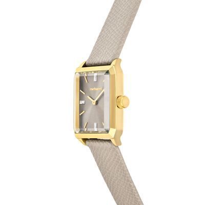 The Séraphine watch features an elegant Saffiano-finished bracelet and a perfectly proportioned angular case that feels refined and delicate without excess. The sunray-finished dial is accented with a small crystal detail, adding a subtle touch of light. Available in taupe, black, navy or light grey, it brings a timeless, graceful presence to any look.