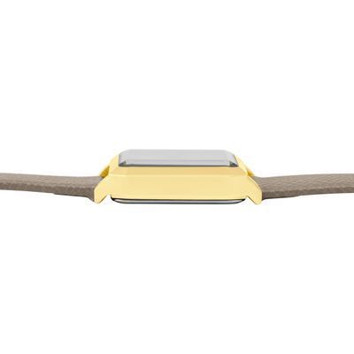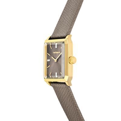 The Séraphine watch features an elegant Saffiano-finished bracelet and a perfectly proportioned angular case that feels refined and delicate without excess. The sunray-finished dial is accented with a small crystal detail, adding a subtle touch of light. Available in taupe, black, navy or light grey, it brings a timeless, graceful presence to any look.