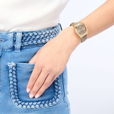 The “Vivienne” watch in taupe adds an elegant, colorful touch to any occasion. Featuring a gold case and accents, it blends warmth with timeless appeal. The tone-on-tone sunray dial complements the vibrant taupe strap, giving the classic design a modern, on-trend feel. Made with a genuine leather strap, this watch effortlessly coordinates with other accessories from the collection.