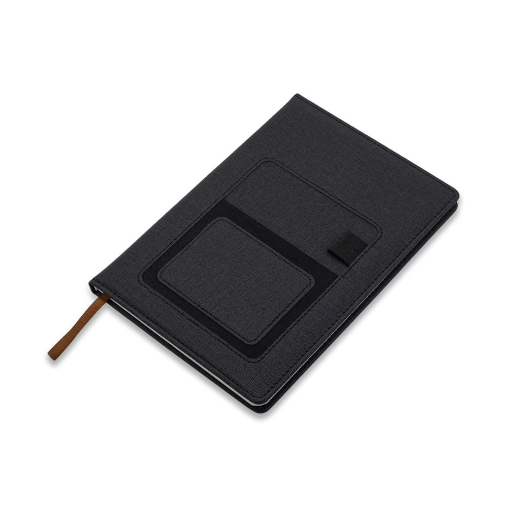 Zápisník A5 v pevné vazbě s elastickou kapsou na mobilní telefon a poutkem na pero. 80 listů linkovaného papíru (80 g/m2).