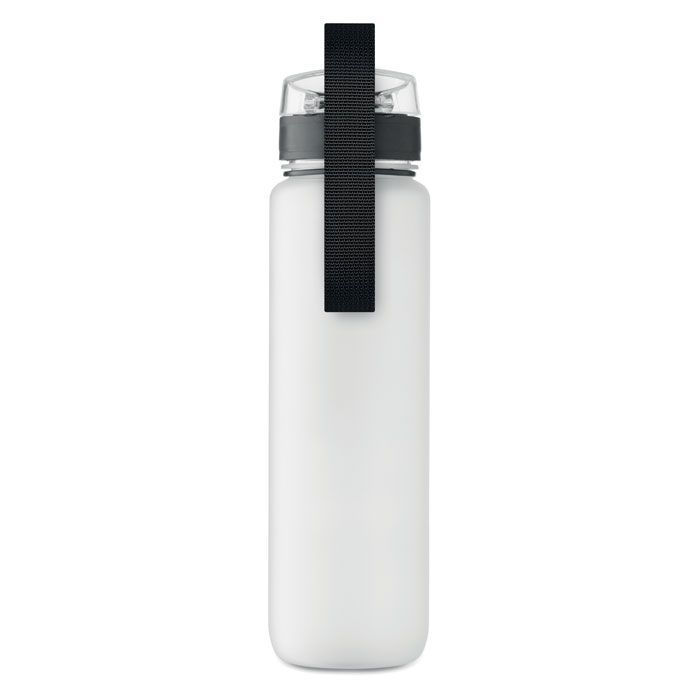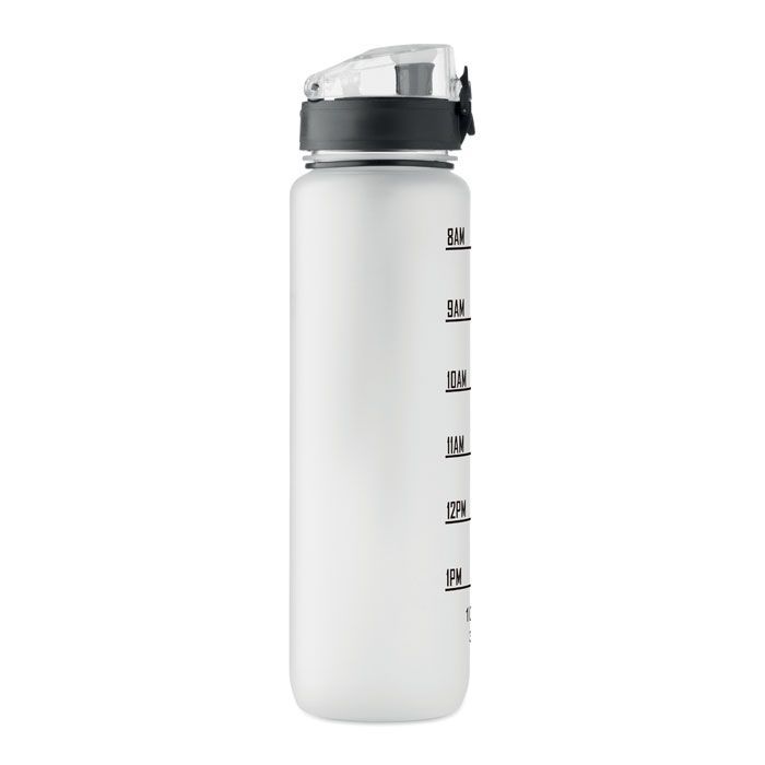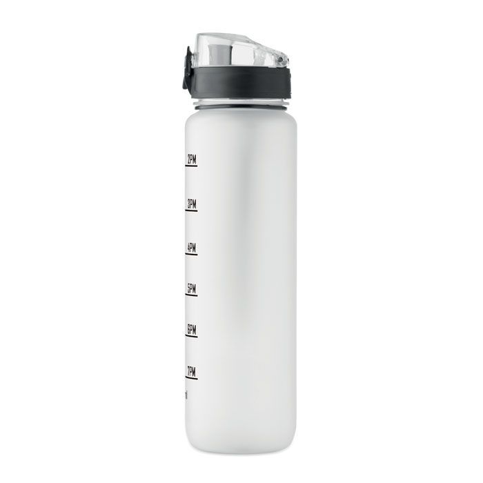 Sportovní RPET láhev na vodu, motivační časové značky, víčko otevíratelné jednou rukou, bezpečnostní zámek a popruh na přenášení. Objem: 1 l.