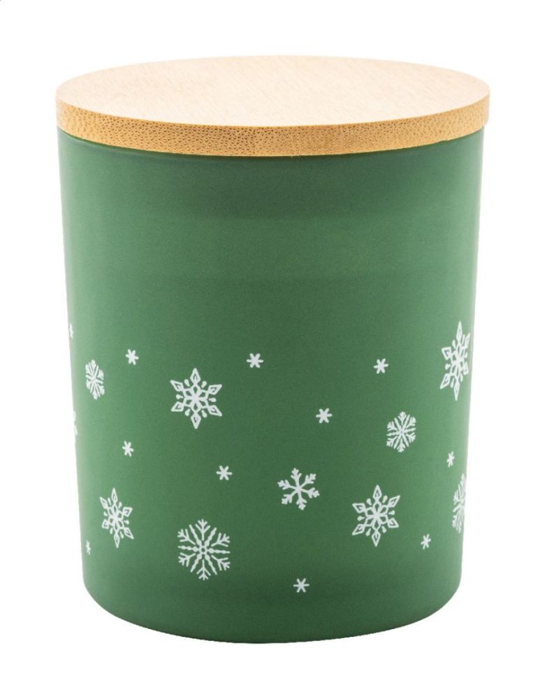 Vonná vosková sviečka na rastlinnej báze v matnom sklenenom držiaku s vianočnou ozdobou v tvare snehovej vločky a bambusovým viečkom. So 120 gramami vosku. V krabičke z kraftového papiera.