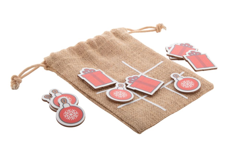 Piškvorky s vianočným dizajnom z brezovej preglejky s 10 žetónmi a jutovým vrecúškom.