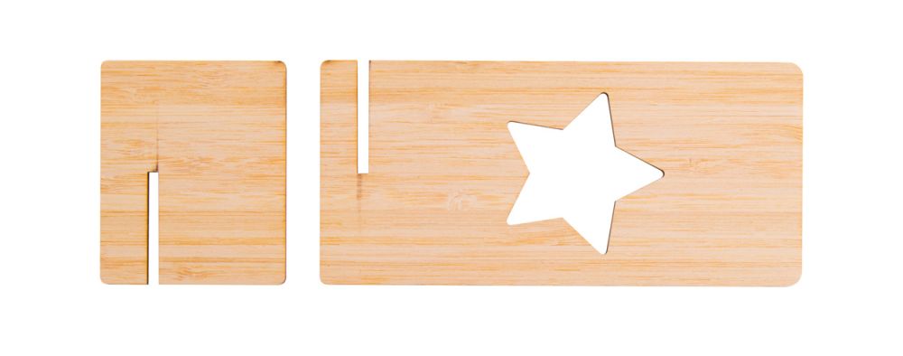 Stojan na mobilný telefón z bambusovej preglejky s vyrezávaným vianočným motívom. Dodáva sa v rozloženom stave.