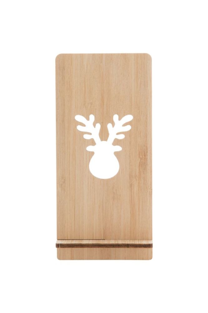 Stojan na mobilný telefón z bambusovej preglejky s vyrezávaným vianočným motívom. Dodáva sa v rozloženom stave.