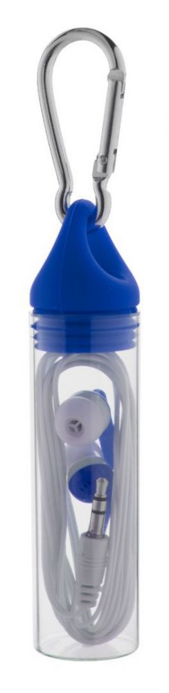 Slúchadlá do uší s 3,5 mm audio jackom v plastovej krabičke s karabínkou a rovnako sfarbeným vŕškom.