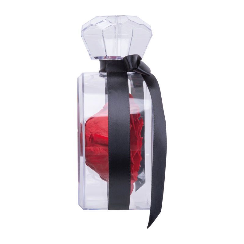 Skutočná konzervovaná ruža (večná ruža) v elegantnej akrylovej krabičke v podobe krištálu, previazaná stuhou. Ruža si zachováva svoju prirodzenú krásu niekoľko rokov – štýlový a dlhotrvajúci darček.