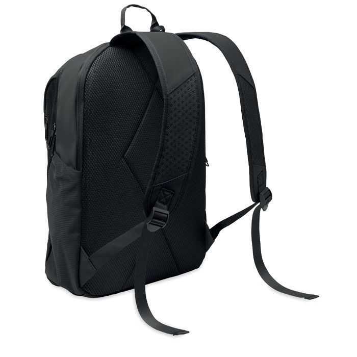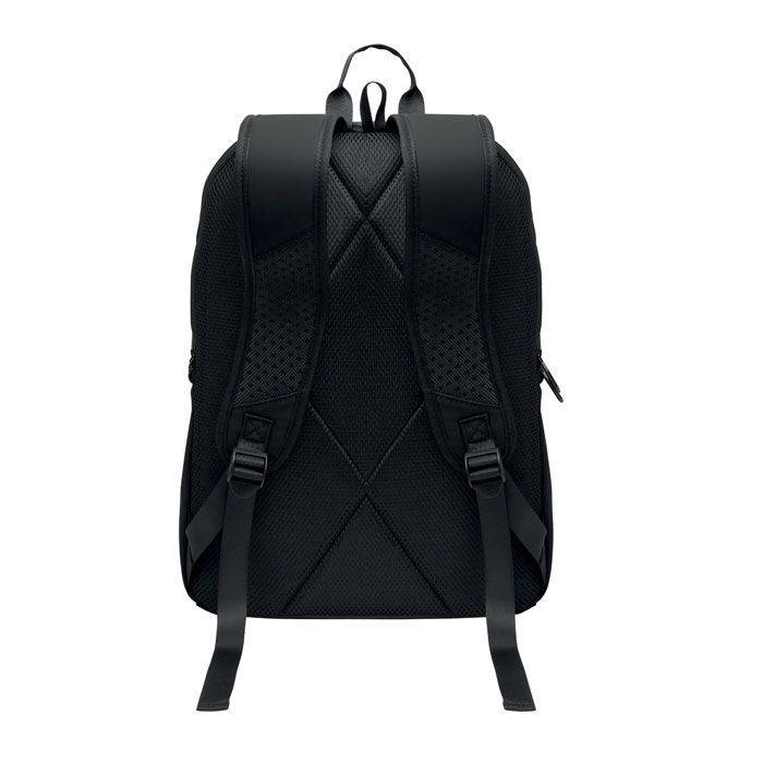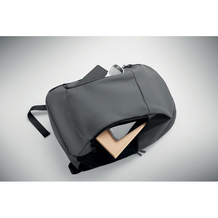 Batoh na 15palcový notebook z měkkého PU s polstrovanými zády a skrytým hlavním prostorem na zip. Jedna přední kapsa na zip, dve přední boční kapsy na zip a 2 boční kapsy z elastické síťoviny. S podšívkou z 210D RPET.