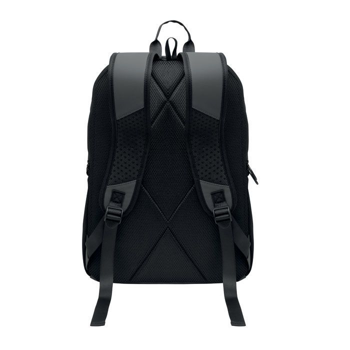Batoh na 15palcový notebook z měkkého PU s polstrovanými zády a skrytým hlavním prostorem na zip. Jedna přední kapsa na zip, dve přední boční kapsy na zip a 2 boční kapsy z elastické síťoviny. S podšívkou z 210D RPET.