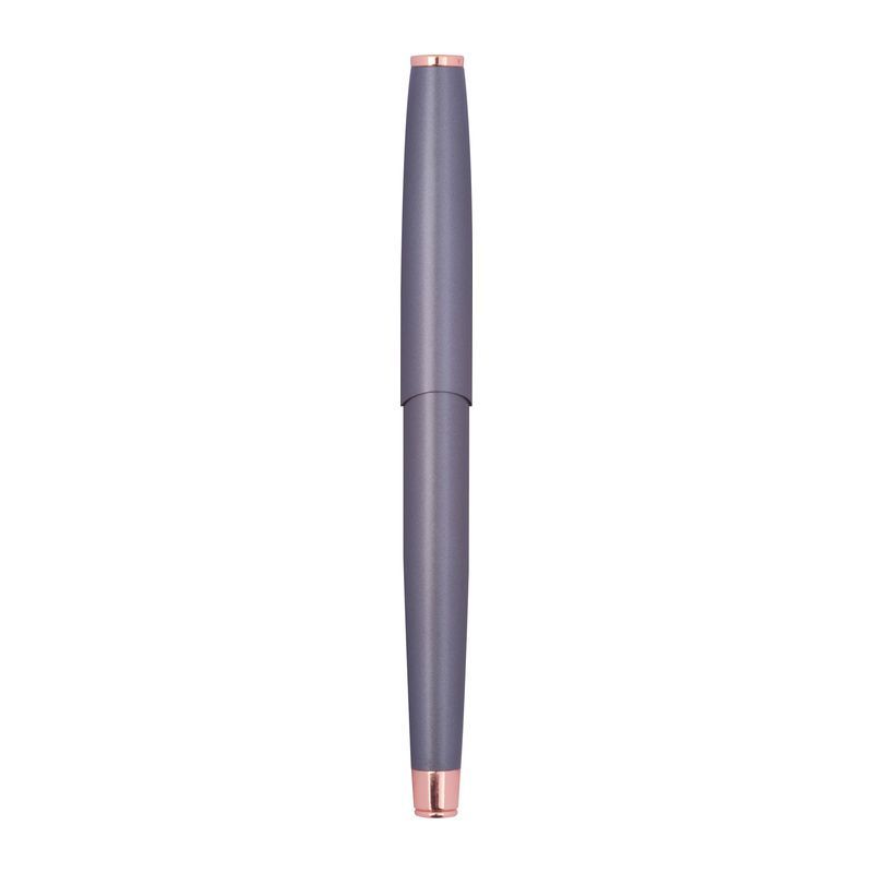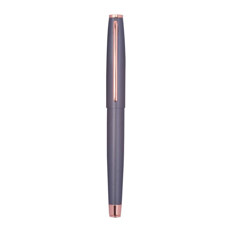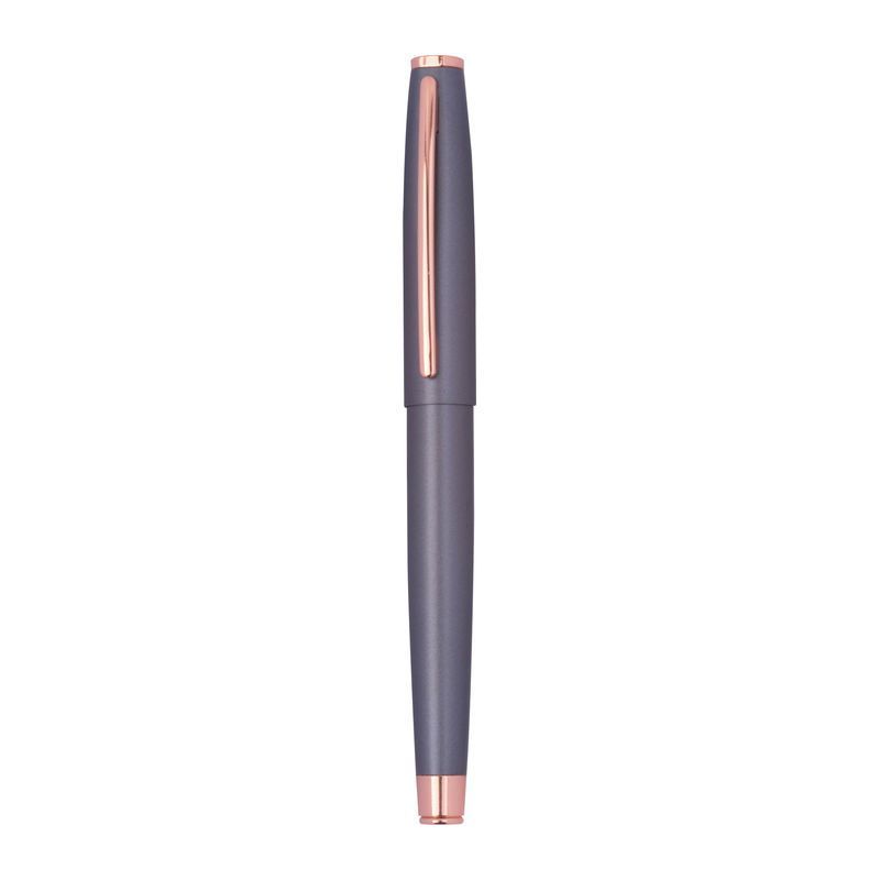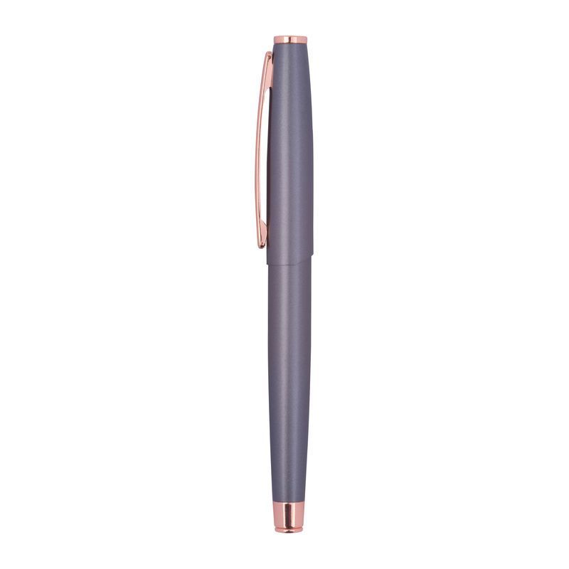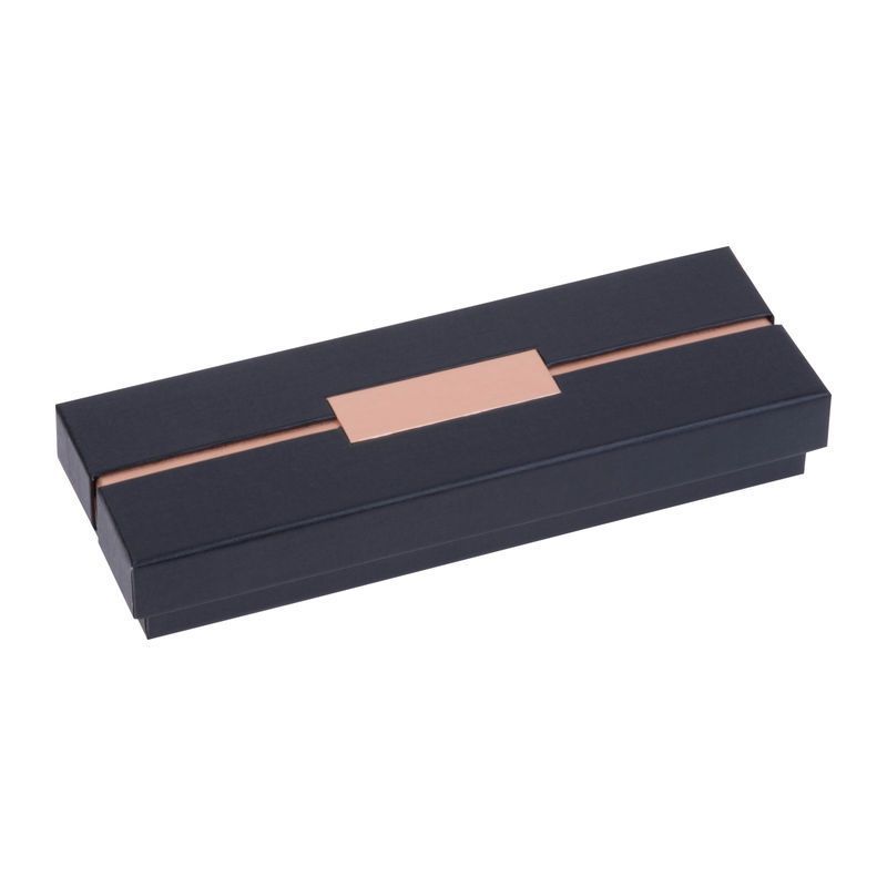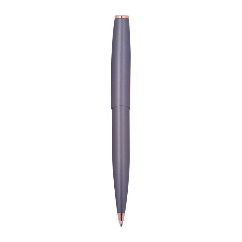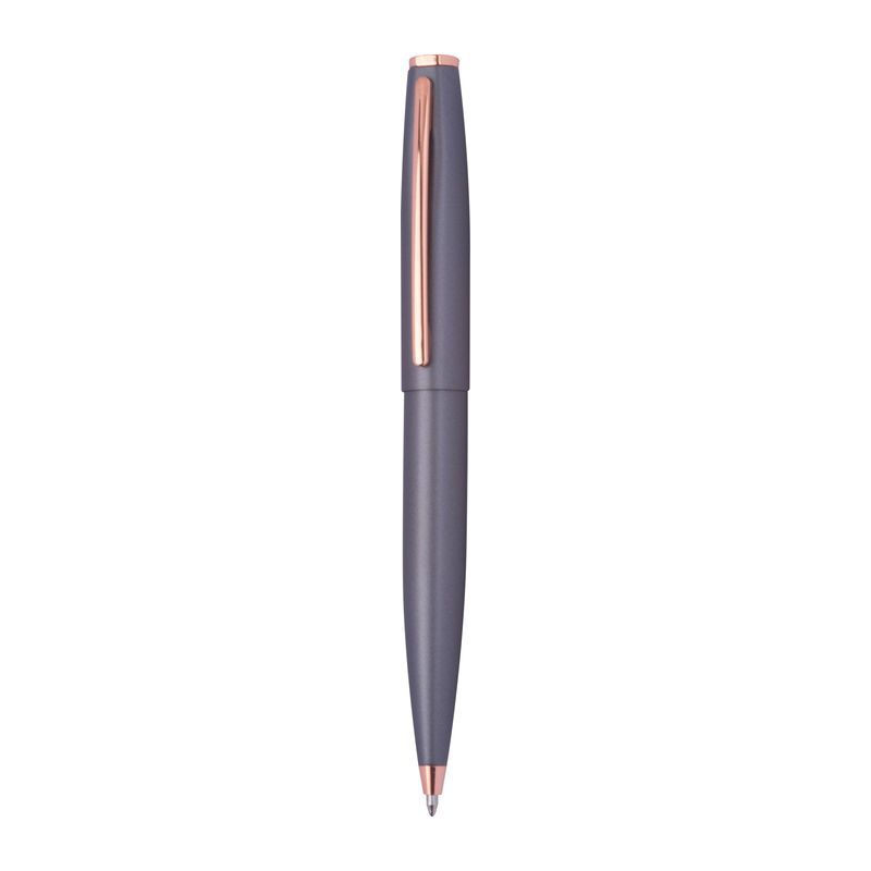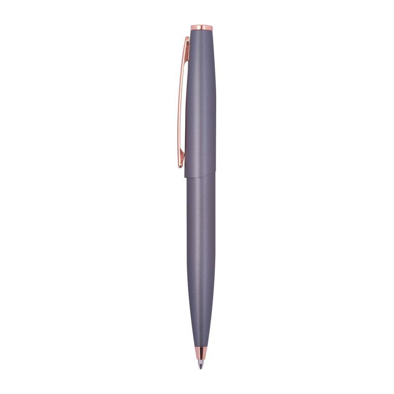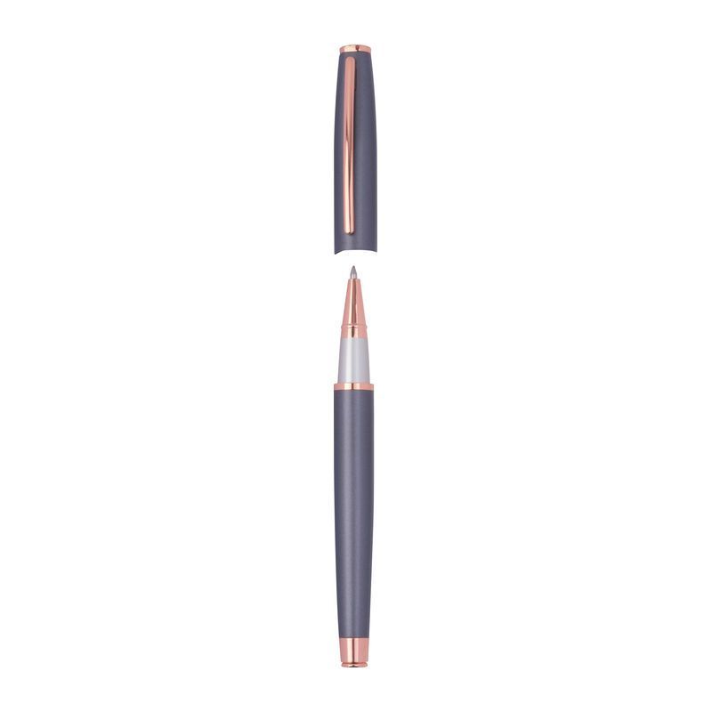 Kovová písacia sada CrisMa, pozostávajúca z guľôčkového pera twist (dĺžka písania 800 m) a roller pera (dĺžka písania 500 m) z kovu s detailmi vo farbe rosegold. Oba perá píšu modrou a sú balené v čiernej kartónovej krabičke