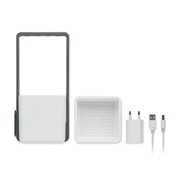 Domácí pěstební zahrádka se 4 LED světly. Materiál: PP a ABS. Součástí je 1 květináč, 1 zásobník/filtr, kabel USB a adaptér A/C. Nízkonapěťový vstup: 5V.