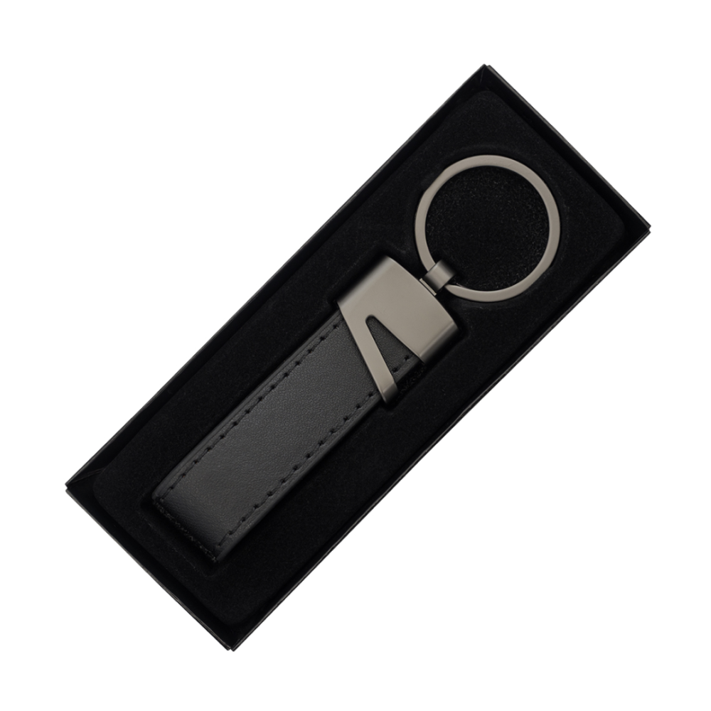 Přívěsek z matného grafitového kovu a eko kůže v černé dárkové krabičce.