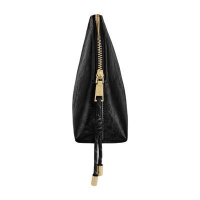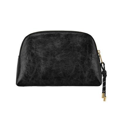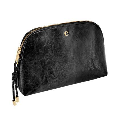 The Philomene cosmetic pouch combines elegance with a bold, contemporary attitude. Crafted from a glazed, crinkled leather-like texture, it is signed with the signature Cacharel C plate and refined gold trims, creating a look that feels both modern and sophisticated. Its roomy shape allows for generous storage, making it ideal for carrying a wide selection of beauty or travel essentials. The design is completed with a distinctive cord zipper puller for a fashion-forward touch and a small Cacharel PU tag inside as a subtle signature detail. Available in black, camel, and burgundy.