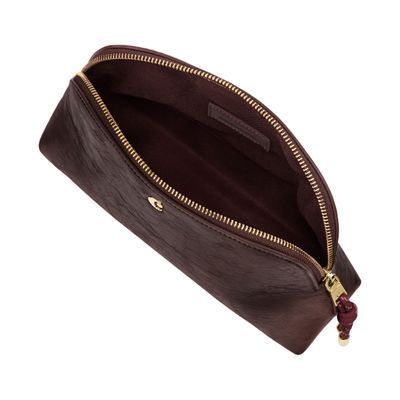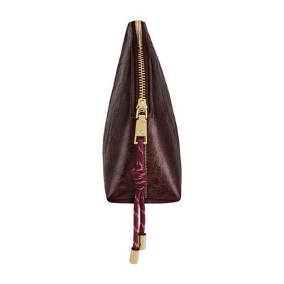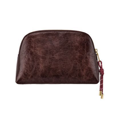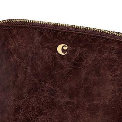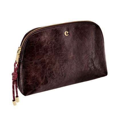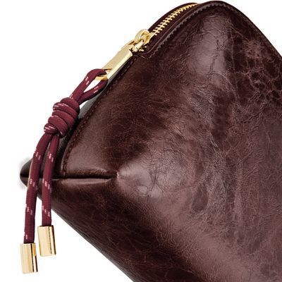 The Philomene cosmetic pouch combines elegance with a bold, contemporary attitude. Crafted from a glazed, crinkled leather-like texture, it is signed with the signature Cacharel C plate and refined gold trims, creating a look that feels both modern and sophisticated. Its roomy shape allows for generous storage, making it ideal for carrying a wide selection of beauty or travel essentials. The design is completed with a distinctive cord zipper puller for a fashion-forward touch and a small Cacharel PU tag inside as a subtle signature detail. Available in black, camel, and burgundy.