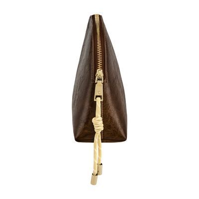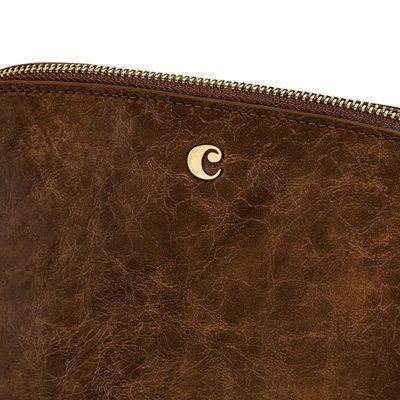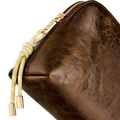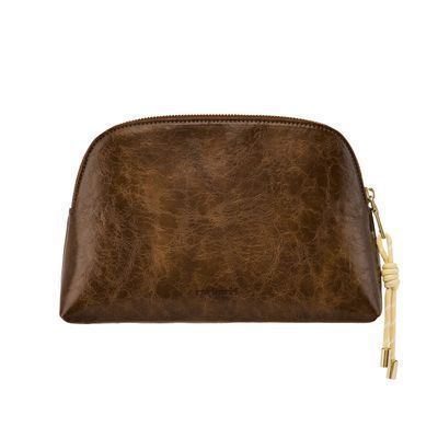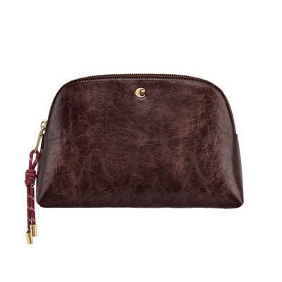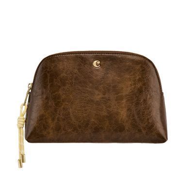 The Philomene cosmetic pouch combines elegance with a bold, contemporary attitude. Crafted from a glazed, crinkled leather-like texture, it is signed with the signature Cacharel C plate and refined gold trims, creating a look that feels both modern and sophisticated. Its roomy shape allows for generous storage, making it ideal for carrying a wide selection of beauty or travel essentials. The design is completed with a distinctive cord zipper puller for a fashion-forward touch and a small Cacharel PU tag inside as a subtle signature detail. Available in black, camel, and burgundy.