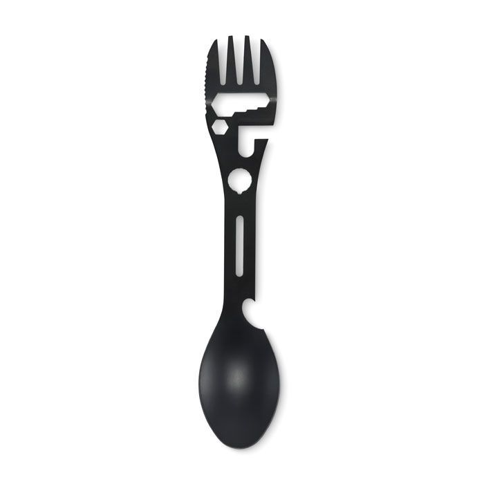 Multifunkční nástroj z nerezové oceli. Zahrnuje lžíci, vidličku, šestihranný klíč, otvírák na lahve, imbusový klíč, zoubkovaný nůž, otvírák a polohovací klíč.