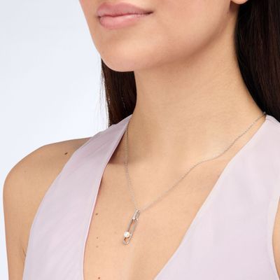 The “Apolline” necklace in silver blends elegance with timeless femininity. The delicacy of the lustrous white glass pearl, the inlaid crystal detail on the link, and the oval-shaped pendant add a touch of luxury. Perfectly versatile, this necklace pairs effortlessly with any wardrobe. The “Apolline” necklace is made of stainless steel, crystal, and white glass pearl.