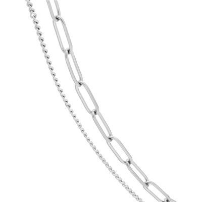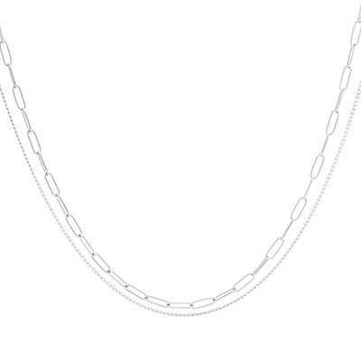 The Olympe necklace uses trompe-l’œil to create the look of two chains in one refined piece. A fine Cuban link meets a larger oval chain for an elegant, minimal balance that complements any style. Available in radiant gold or sleek silver and signed with a discreet Cacharel signature plate, it becomes an effortless statement of style.