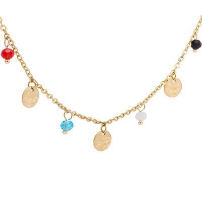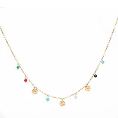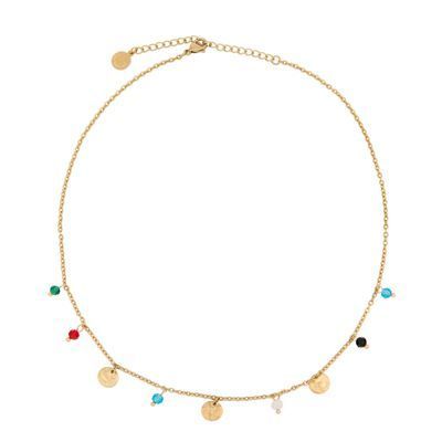 The Séraphine necklace is dainty and light, adorned with small colorful beads that bring a relaxed hobo-chic vibe to its golden hue. Easy to layer or wear on its own, it adds a soft, colorful touch to any outfit while keeping the look refined and effortless. Finished with a discreet Cacharel signature plate, it becomes a gentle statement of style.