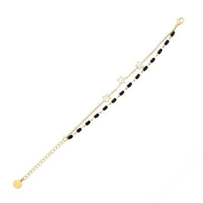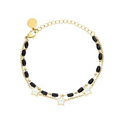 The “Vivienne” bracelet in Gold & Black is a playful and elegant trompe l'oeil double bracelet, featuring a mix of small pearls and star elements with a nacre finish. Signed at its closing with a Cacharel signature plate, this bracelet exudes distinct charm. Made of stainless steel, it’s a versatile accessory that effortlessly adds a touch of sophistication to any outfit.