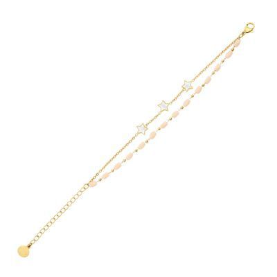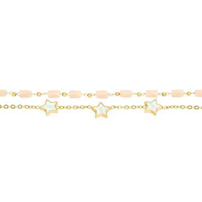 The “Vivienne” bracelet in Gold & Nude is a playful and elegant trompe l'oeil double bracelet, featuring a mix of small pearls and star elements with a nacre finish. Signed at its closing with a Cacharel signature plate, this bracelet exudes distinct charm. Made of stainless steel, it’s a versatile accessory that effortlessly adds a touch of sophistication to any outfit.
