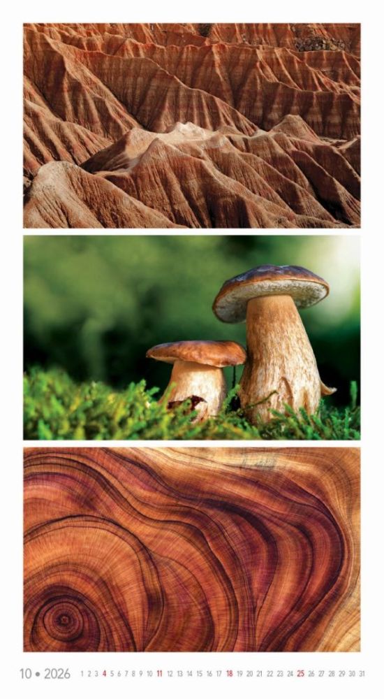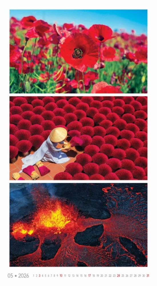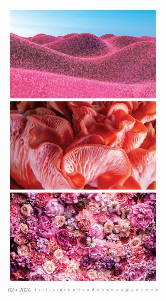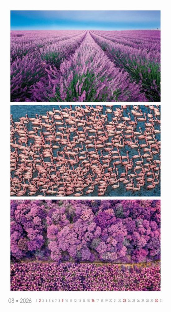 Kalendár, ktorý oslavuje rozmanitosť prírody v jej najfarebnejších podobách. Každý mesiac prináša očarujúce fotografie zachytávajúce žiarivé scenérie – od kvetinových polí a jesenných lesov až po exotické krajiny a fialové levanduľové lány. Ideálny pre tých, ktorí milujú prírodu a jej farebný svet.