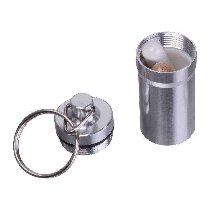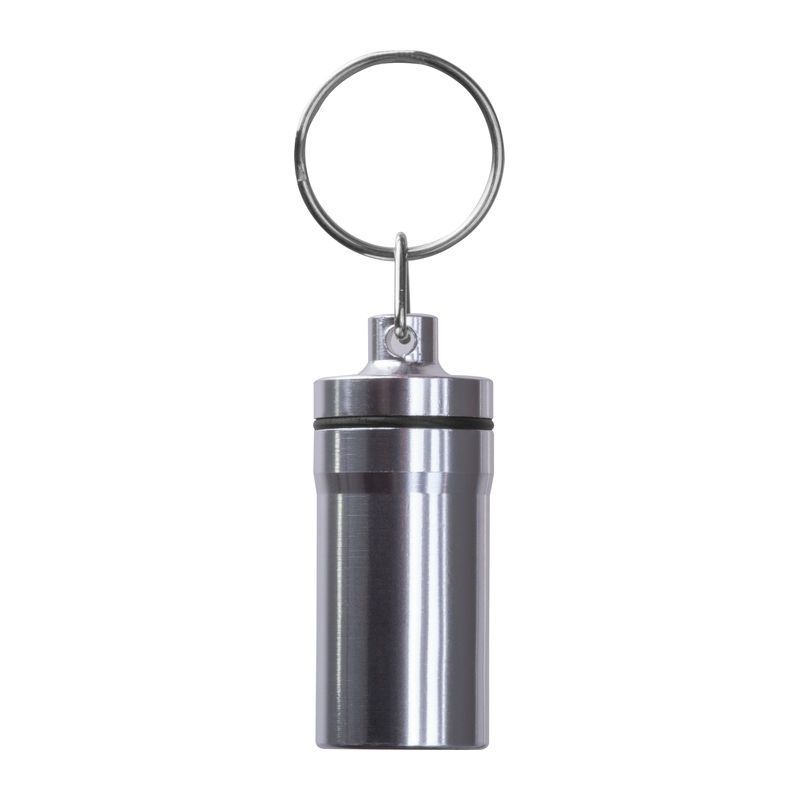 Prívesok na kľúče s vonkajším povrchom z nehrdzavejúcej ocele a vnútorným plastom. Ideálna na bezpečné uloženie malých predmetov na cesty.