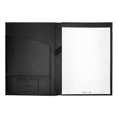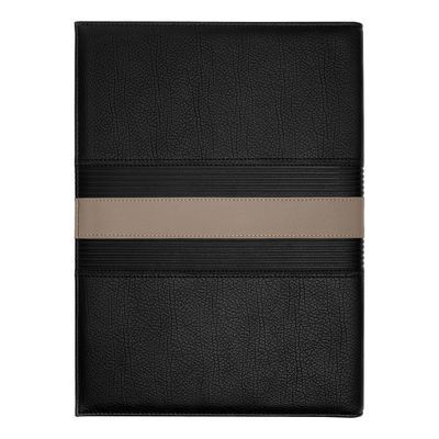 Introducing the CERRUTI 1881 "Delano" writing folders, crafted from vegan leather in classic black with a contrasting beige band and an oversized, subtly embossed logo. These folders, available in A4 and A5 sizes, offer a stylish option for taking notes in meetings or jotting down thoughts on the go.