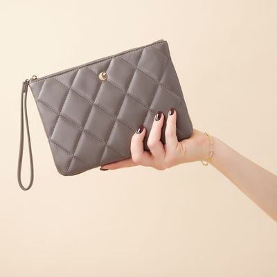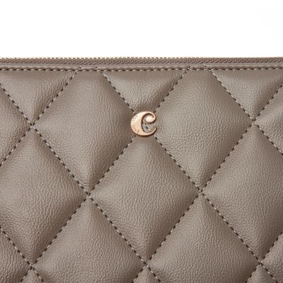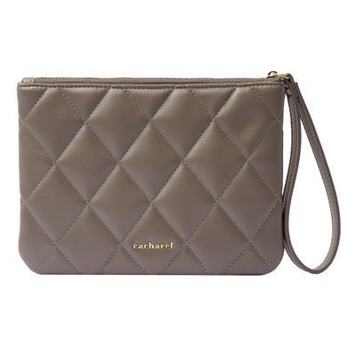 The Cacharel " Ambre" pouch is a luxurious flat accessory suitable for use as an evening clutch or a cosmetic pouch to be placed inside the eponymous tote bag. Crafted from quilted material, it showcases a double logo signature with a main C plate on the front and a small Cacharel signature in gold at the back. The pouch is made of beautifully textured vegan leather and is offered in a neutral color palette, including Black and Taupe. Its versatile design makes it a practical and stylish addition to any wardrobe.