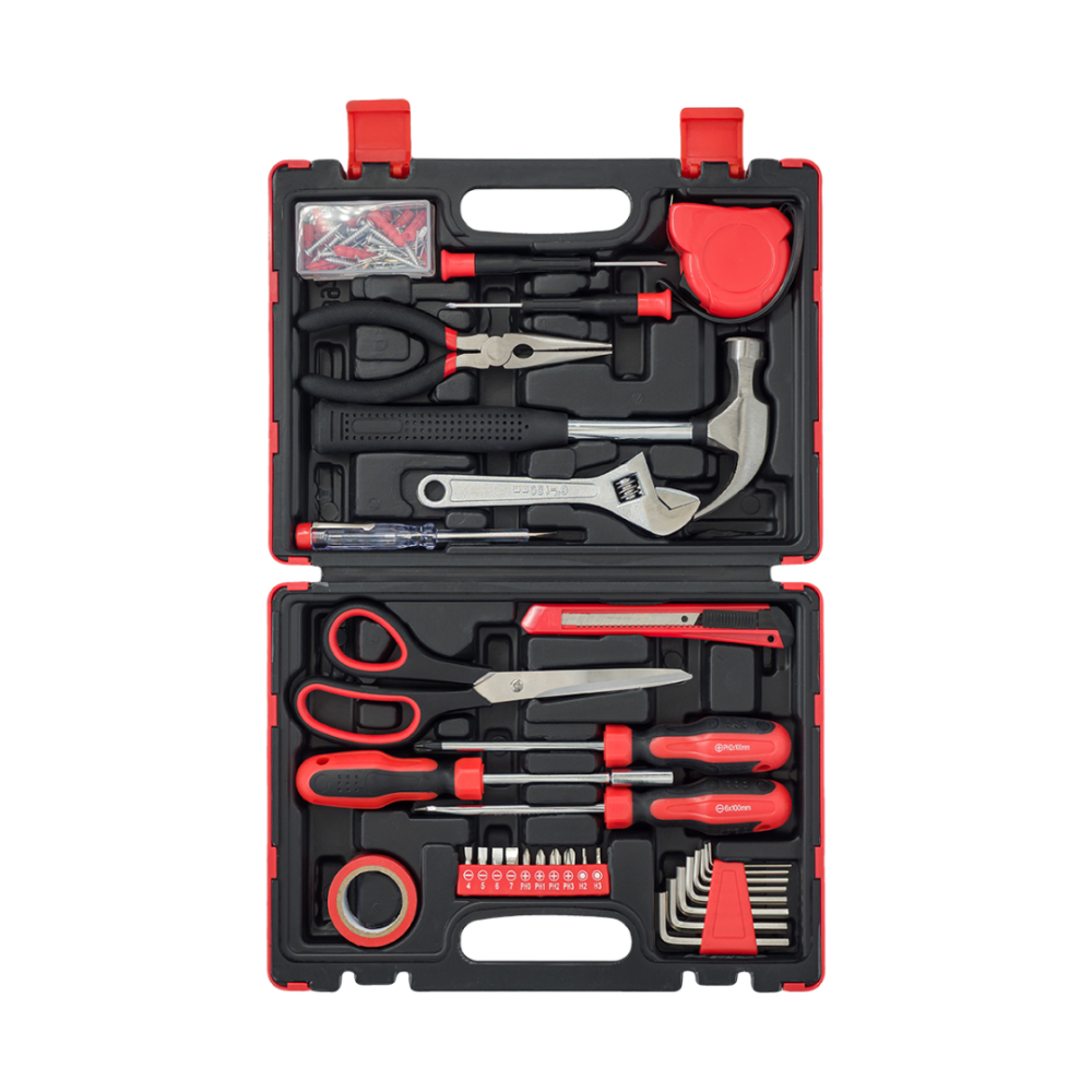 32dílná sada nářadí v pevném kufříku z plastu. Obsah: řezací nůž, 8 ks inbusových klíčů, 10 ks šroubovacích bitů, 2 šroubováky, držák na bity, izolační páska, technické nůžky, zkoušečka napětí, nastavitelný 6" klíč, kladivo, dlouhé 6" kleště, samolepicí páska 3M, 2 ks precizních šroubováků, 80 ks spojovacího materiálu (hřebíky, šrouby, matice, hmoždinky).