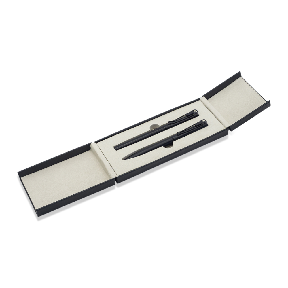 Sada kuličkového a keramického pera balená v dárkové krabičce. Pera mají modrou náplň.