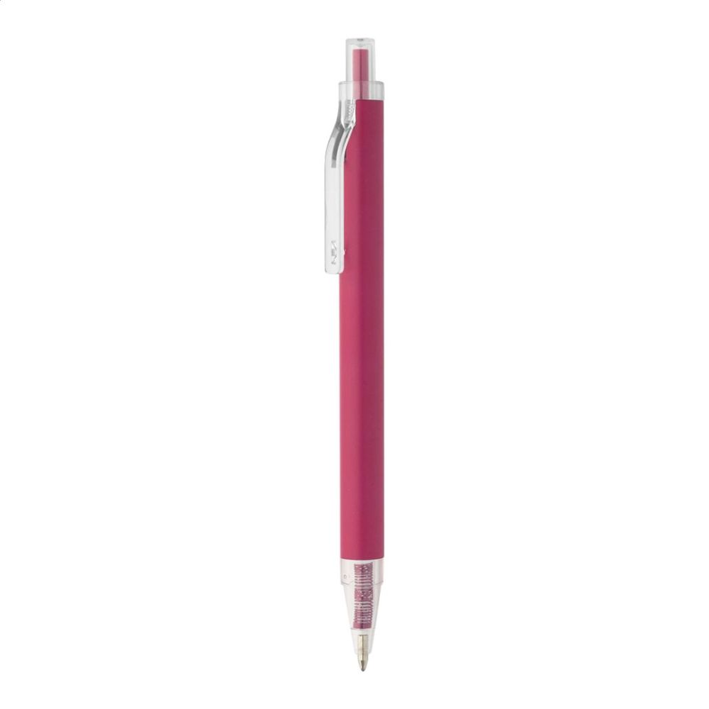Guľôčkové pero z recyklovaného hliníka s matným telom a priehľadnými RPET časťami. S modrou náplňou.
