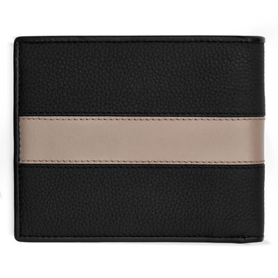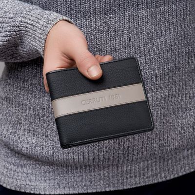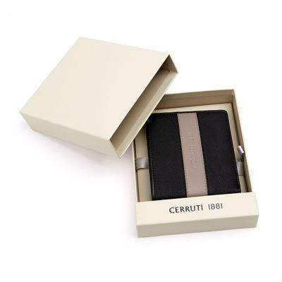 Introducing the Delano card wallet from CERRUTI 1881's Small Leather Goods line, expertly crafted from top-grained leather. The main leather exhibits a grained, matte texture, while the signature logo is subtly embossed on a central band made of smooth leather, providing a tasteful contrast. This card wallet is offered in two sophisticated options: a classic all-black version and an elegant black variant with a contrasting beige logo strap. The Delano card wallet perfectly complements the Delano card holder, combining superior craftsmanship with timeless design