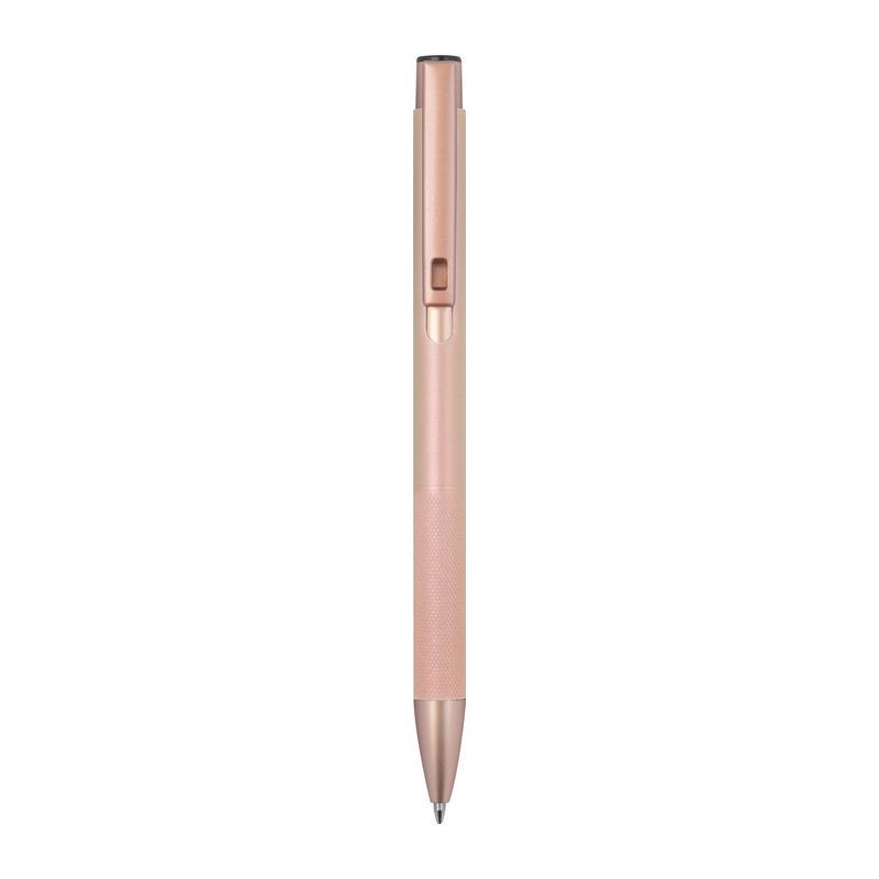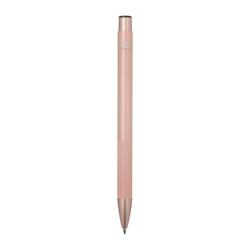 Guľôčkové pero z recyklovaného hliníka s matným povrchom, ružovo-zlatými detailmi, modrou náplňou a úchopom s diamantovým vzorom