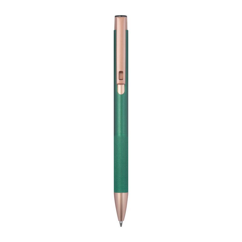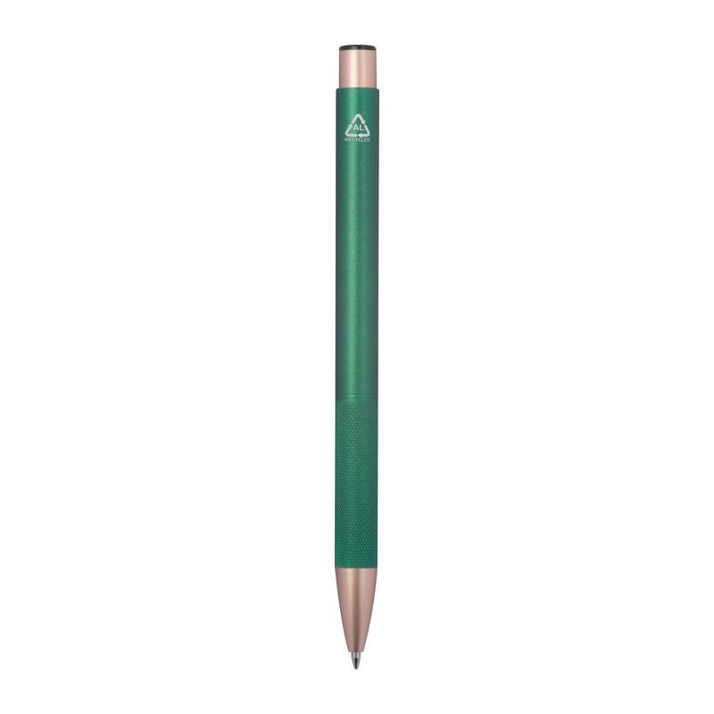 Guľôčkové pero z recyklovaného hliníka s matným povrchom, ružovo-zlatými detailmi, modrou náplňou a úchopom s diamantovým vzorom