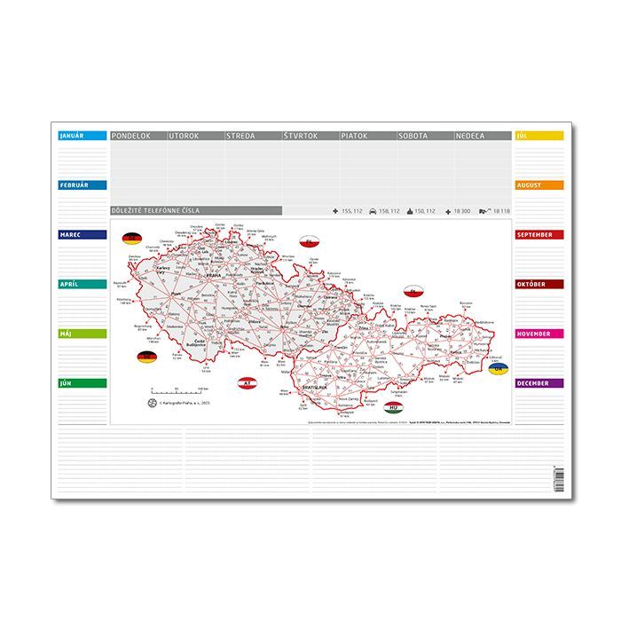 Ideálny doplnok v kancelárii na Váš pracovný stôl. Podložka obsahuje týždenné aj ročné kalendárium určené na zapisovanie jednotlivých poznámok v konkrétnom dni. Prehľadná mapa vzdialeností v Čechach a na Slovensku.Podložka je doplnená o transparentnú plastovú spodnú lištu, ktorá je ideálna na reklamnú potlač. Vhodná pre firmy ako praktický a zároveň reprezentatívny darček.