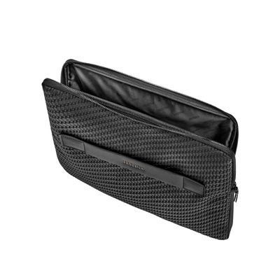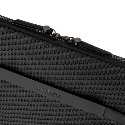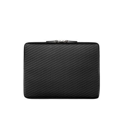 The Interlace laptop pouch in black distills the line’s woven-inspired texture into a minimal, luxurious statement. Crafted to resemble meticulous braiding and finished in a smooth matte, it carries the collection’s depth and sophistication in a sleek, streamlined silhouette. Signed details, including blazon-engraved zipper pullers, subtly elevate its refined character. Designed as the perfect protective companion, it features a slim, elegant construction enhanced by a monogramed lining that completes the piece with impeccable finishing. Accented with sleek gun touches, it embodies rich texture and modern elegance in its purest form.