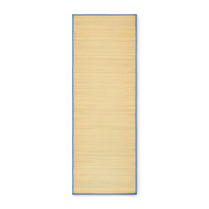 Plážová rohož z přírodní slámy s polyesterovým popruhem na nošení.