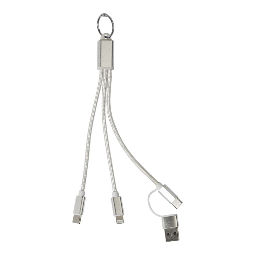 Nabíjací kábel USB-C z recyklovaného hliníka a RPET s príveskom na kľúče. S konektormi micro USB, USB-C a Lightning. S USB a USB-C vstupy.