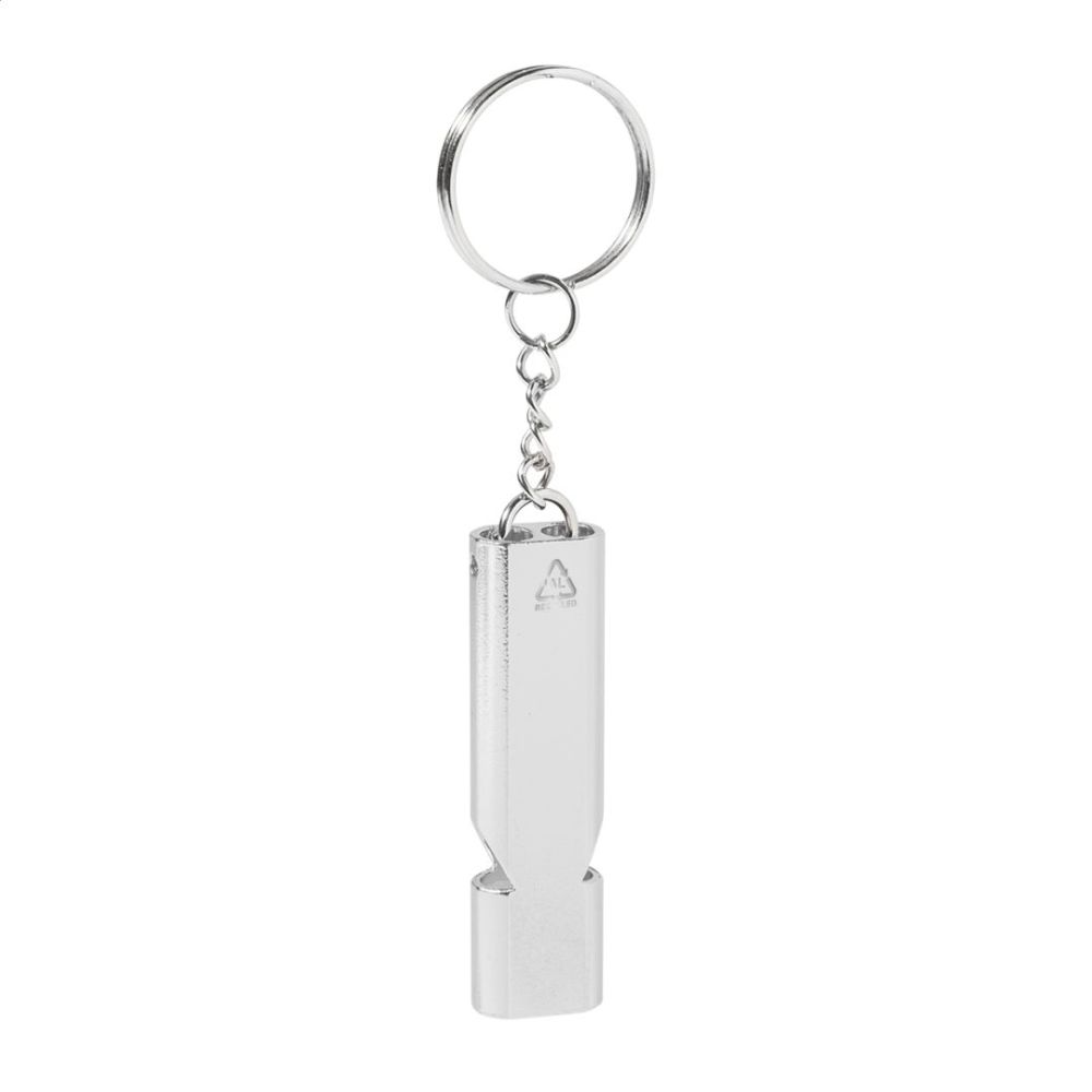 Píšťalka z recyklovaného hliníka s kovovým krúžkom na kľúče.