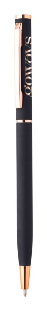 Guľôčkové pero z recyklovaného hliníka s pogumovaným povrchom a detaily z ružového zlata. So špeciálnou povrchovou úpravou na zrkadlové laserové gravírovanie vo farbe ružového zlata. S modrou náplňou.