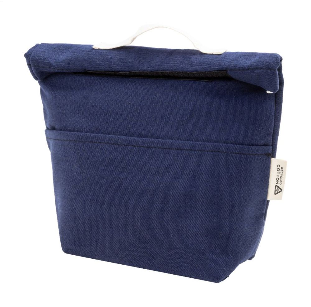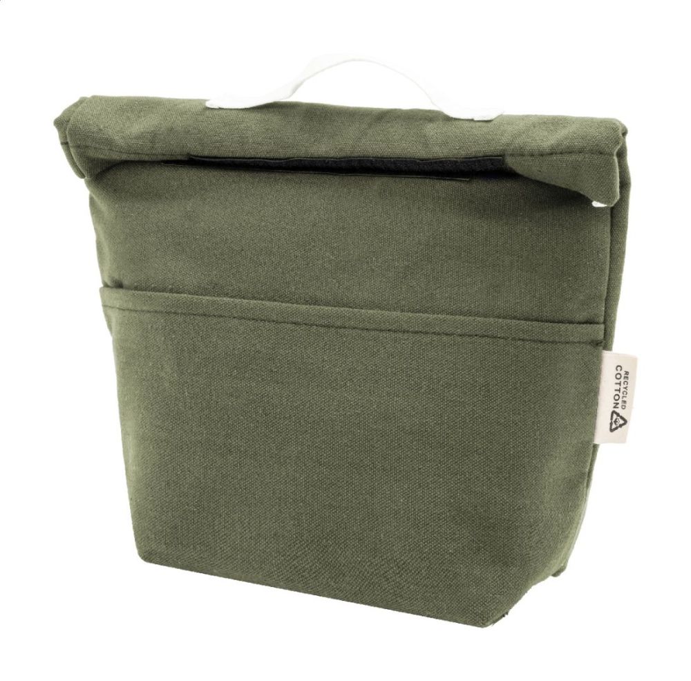 Chladiaca taška z recyklovaného plátna s rolovacím vrchom, predným vreckom, hliníkovou výplňou a zapínaním na suchý zips. 70 % recyklovanej bavlny a 30 % polyesteru RPET. S výrazným štítkom z recyklovanej bavlny.