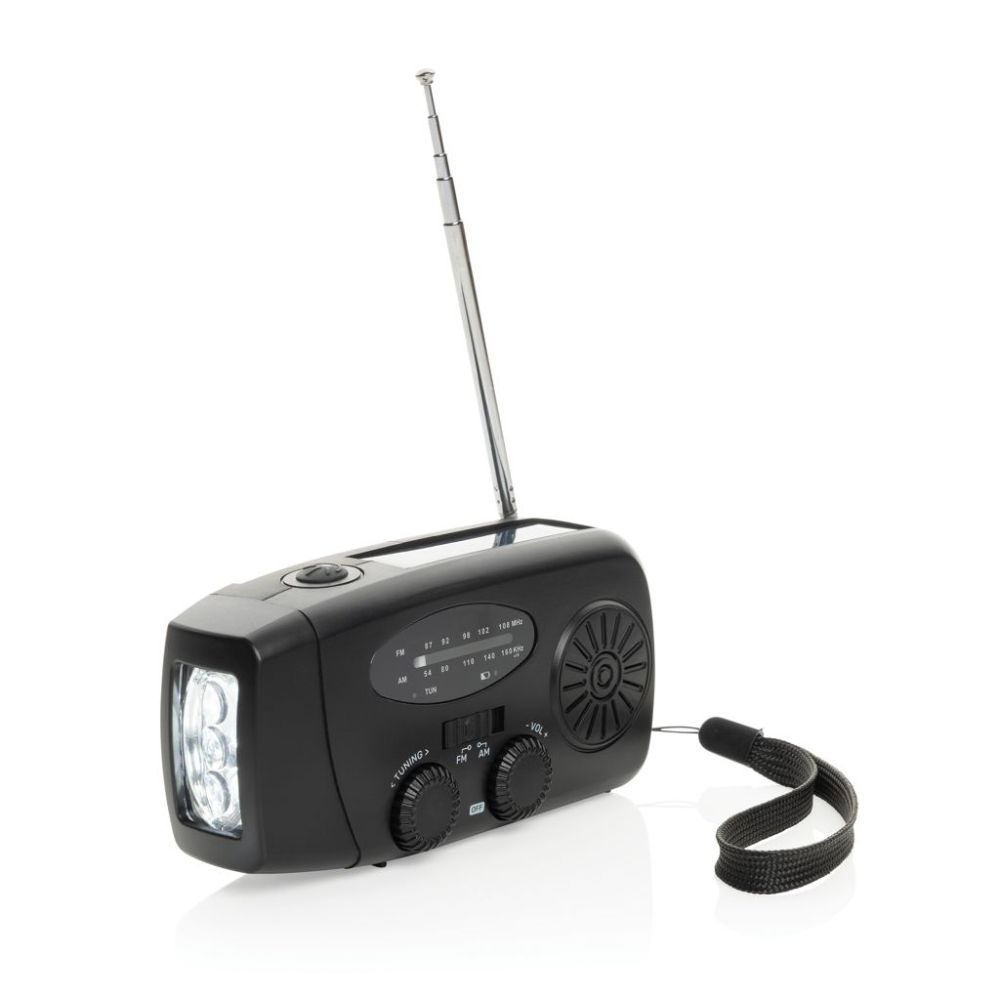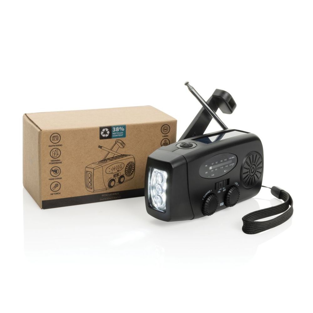 Buďte pripravení na akúkoľvek situáciu s RescueWave, všestranným núdzovým rádiom navrhnutým tak, aby vás udržalo v spojení a nabitých. Ponúka AM/FM rádio, solárny panel, integrované 1W svietidlo, USB výstup a USB-C vstup. S integrovanou batériou s kapacitou 1800mAh môže RescueWave nabiť váš telefón a poskytnúť potrebnú energiu. Ručný pohon poskytuje spoľahlivú funkčnosť – iba 1 minúta točenia umožňuje 5 minút rádiového vysielania alebo 30 minút svietenia. Rádio vydrží až 15 hodín vysielania alebo 8 hodín svietenia na plné nabitie. Vyrobené z recyklovaných materiálov certifikovaných podľa RCS (Recycled Claim Standard). Celkový podiel recyklovaného obsahu: 38 % podľa celkovej hmotnosti produktu. Produkt aj príslušenstvo neobsahujú PVC a sú balené v FSC® obale.