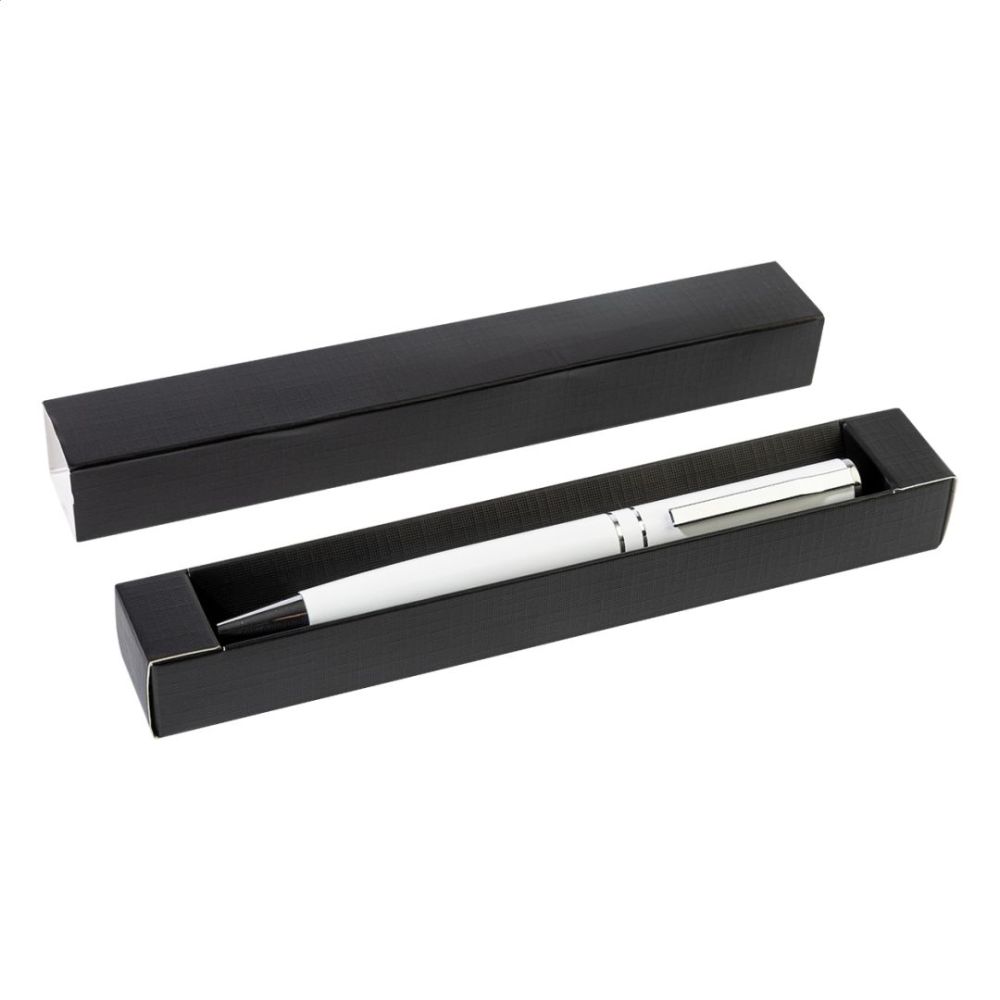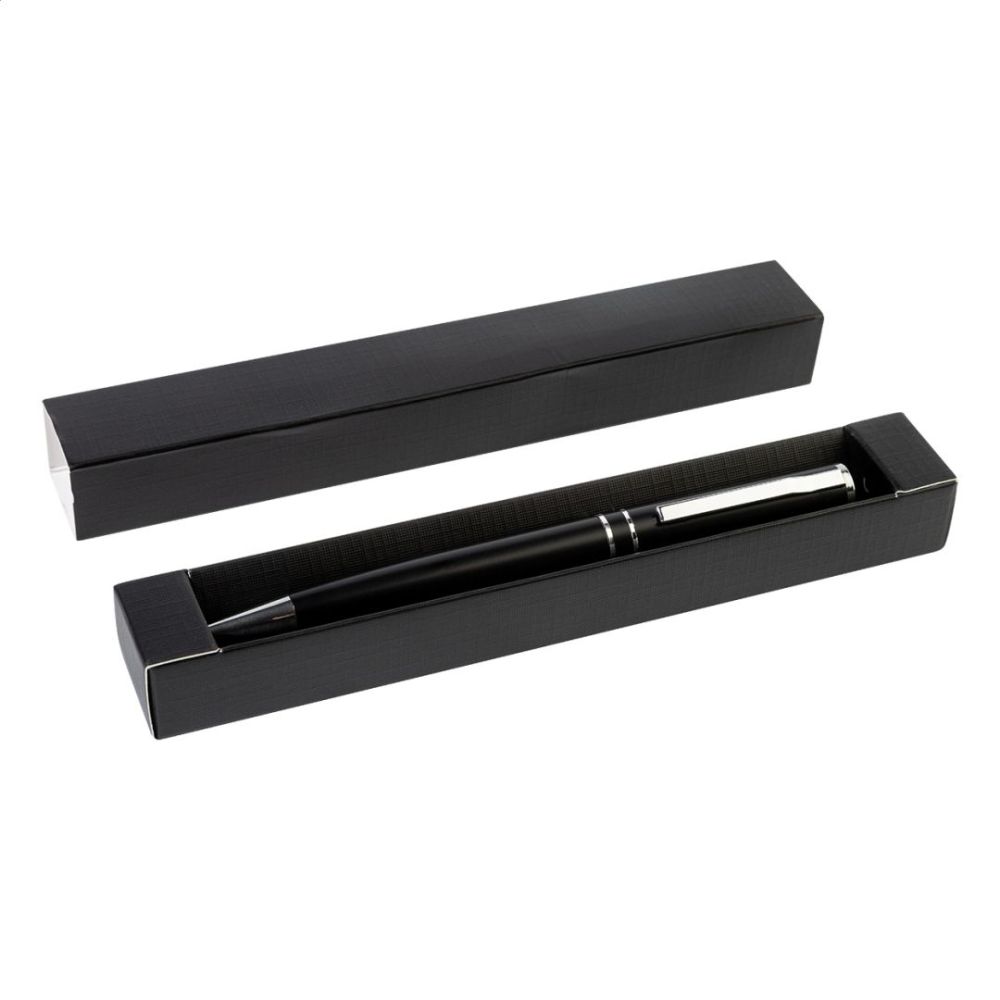 Guľôčkové pero z recyklovaného hliníka s chrómovanými časťami a krúžkami. V čiernej darčekovej krabičke. S modrou náplňou.