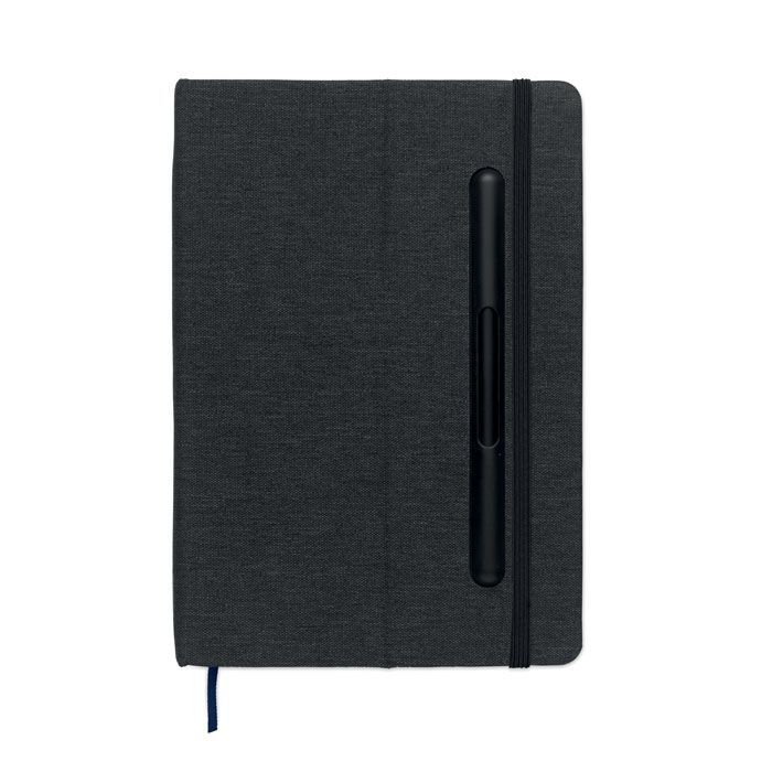 Zápisník formátu A5 s tvrdými deskami z RPET s funkcí držáku na telefon. Integrovaná propiska 2v1 - bezinkoustové a běžné kuličkové pero z ABS. 192 linkovaných stran (96 listů) z recyklovaného papíru. Ladící gumička a záložka. FSC®-certified | FSC MIX CREDIT, P7.1, FSC-C213206