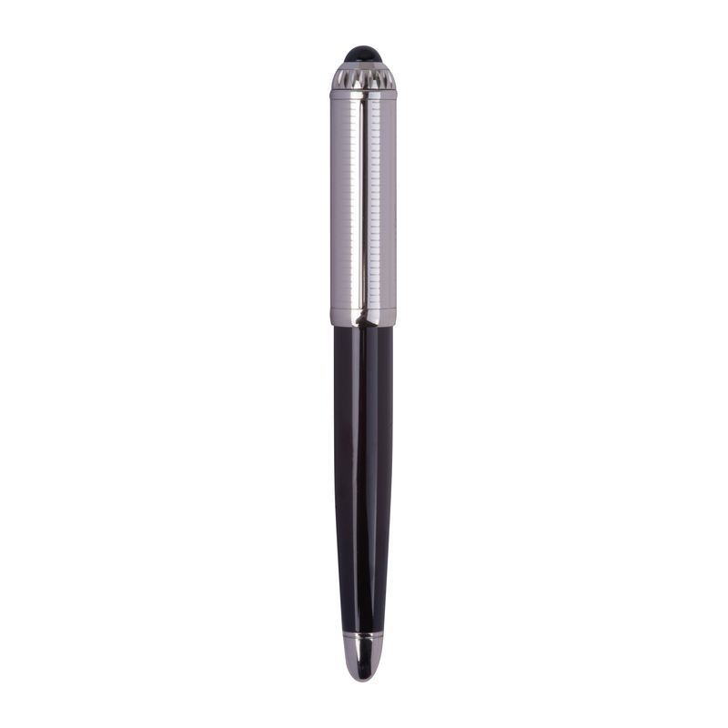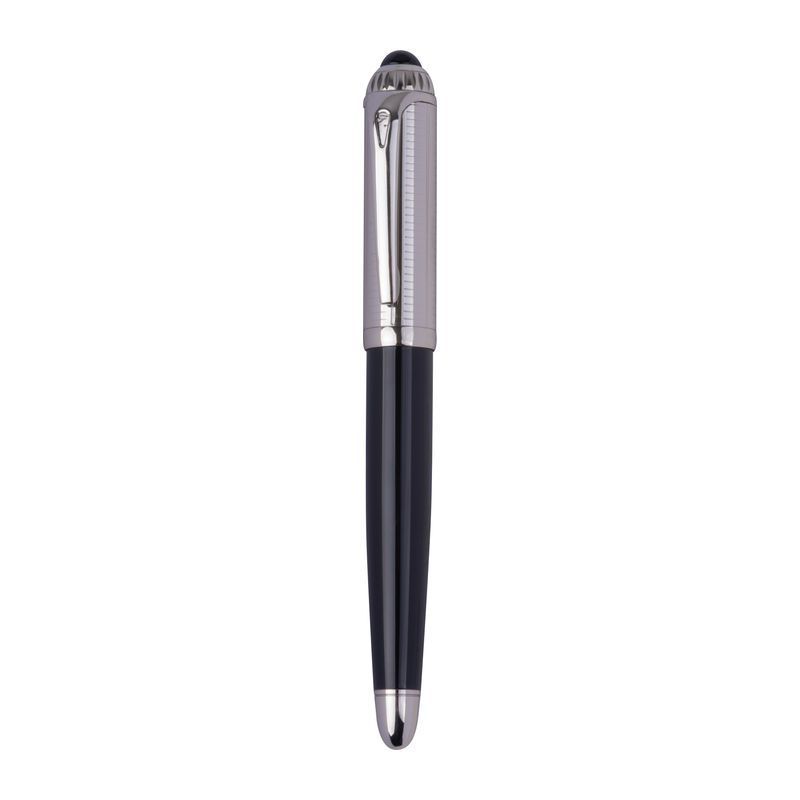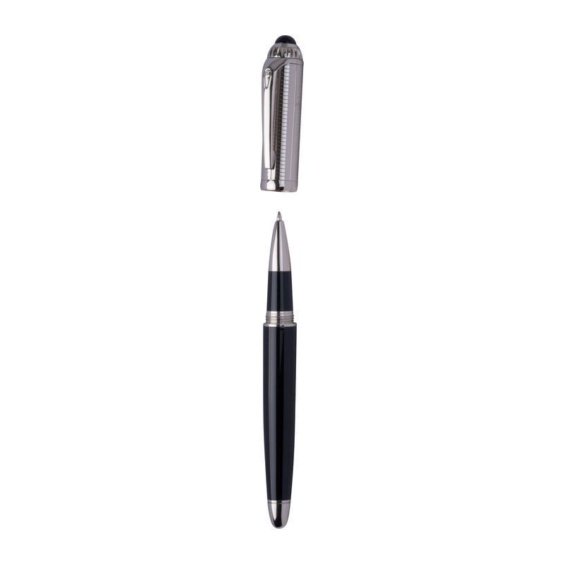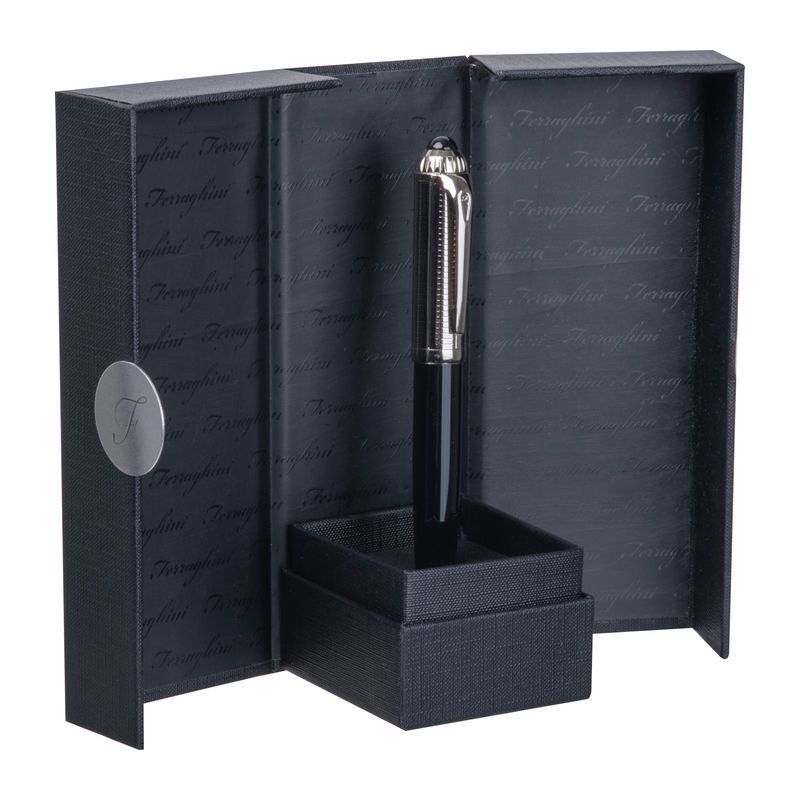 Roller Ferraghini z nehrdzavejúcej ocele, s modrým atramentom a s charakteristickým “F” na klipse, dĺžka písania až 400 m. Balené v kvalitnej krabičke