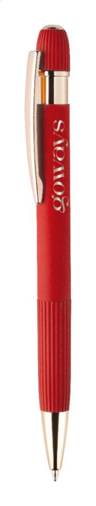 Guľôčkové pero z recyklovaného hliníka s pogumovaným telom a detailmi v ružovo-zlatej farbe.